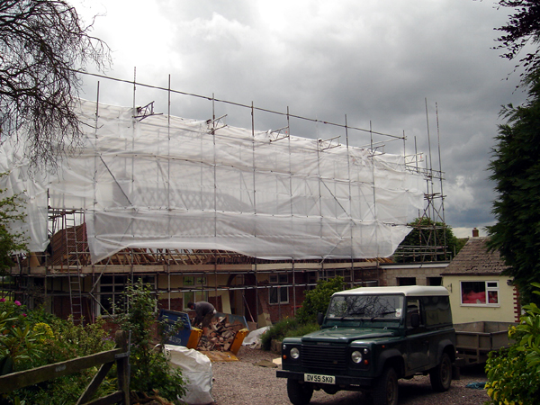 A temporary protection tent successfully defended the existing building from the elements during the construction period.